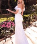 This mermaid gown is an empowering fit with a glitter scroll print and a feathered off shoulder detail with a deep neckline.